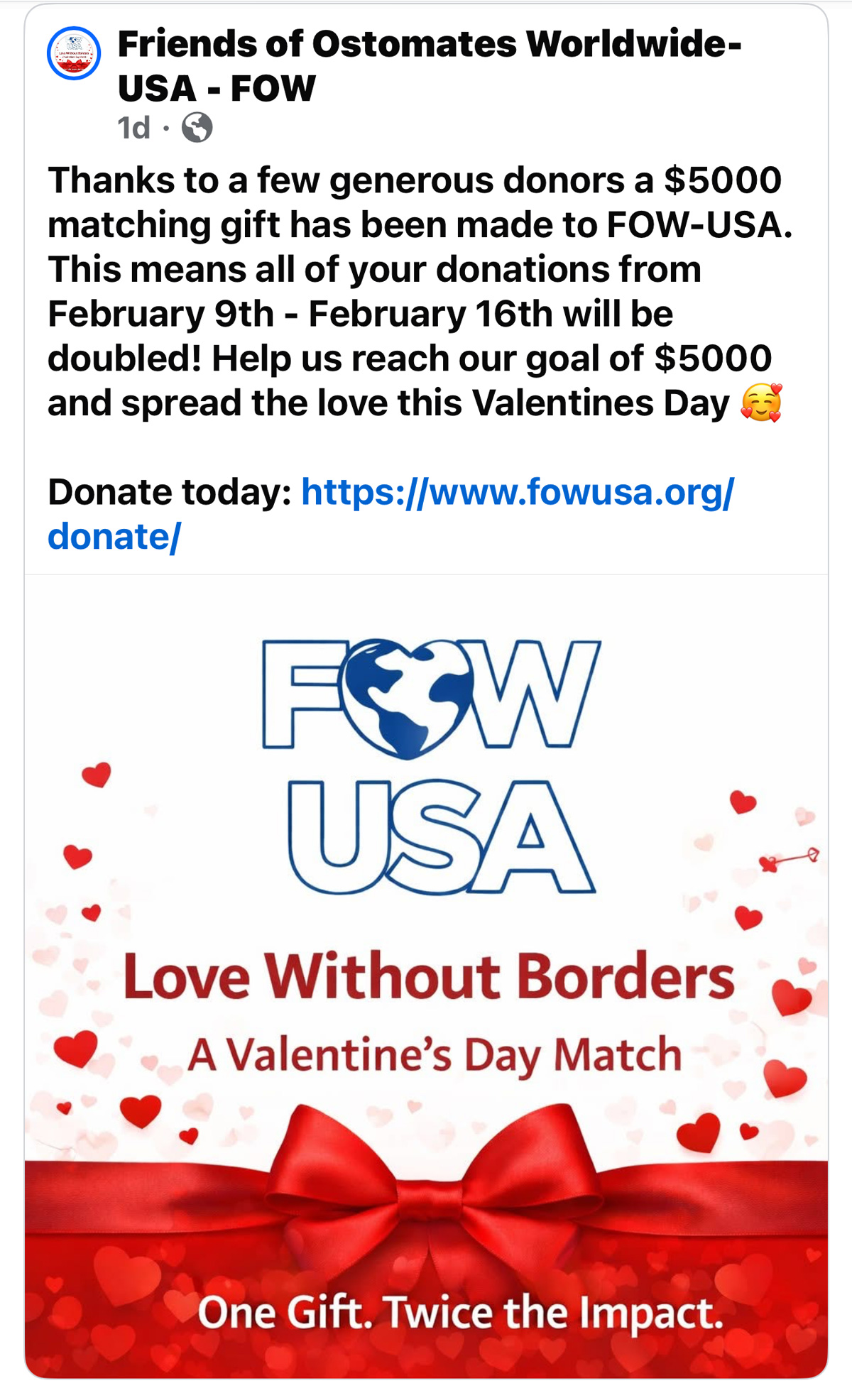 View our special donation MATCH opportunity below for Valentine’s Day week! Click the image below to go to our Donation page, or click here.